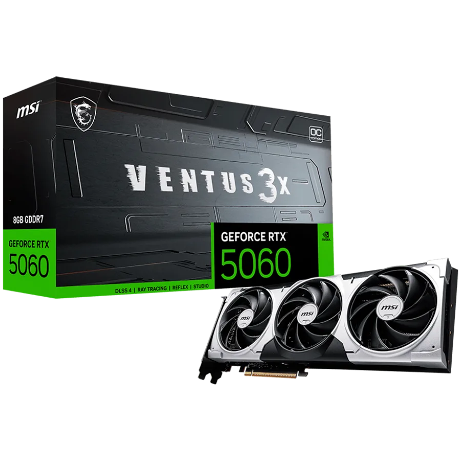 MSI Video Card NVIDIA GeForce RTX 5060 8G VENTUS 3X OC, 8GB GDDR7, 128-bit, 2550 MHz Boost, 3840 CUDA Cores, PCIe 5.0 (x8), 3x DP 2.1b, HDMI 2.1b, RAY TRACING, Triple Fan, 155W TDP, 8-pin PCIe Power, G-SYNC, 3Y