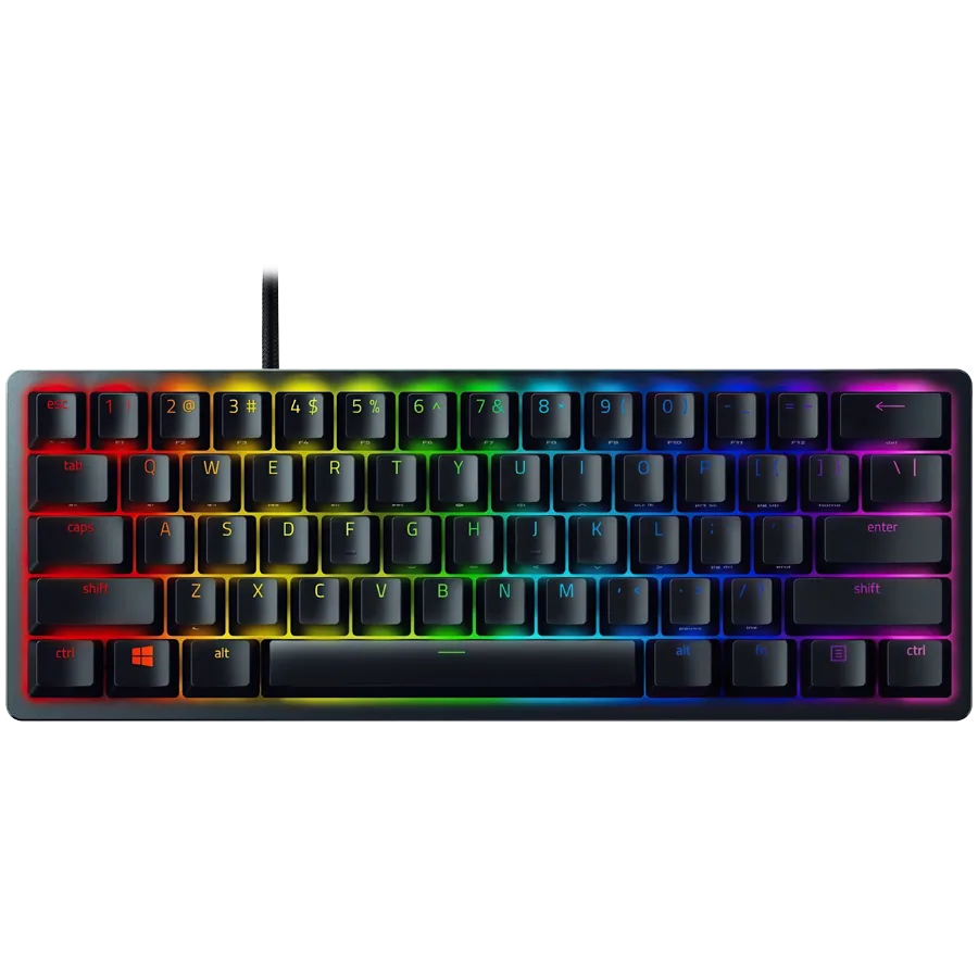 Razer Huntsman Mini – Clicky Optical (Purple Switch) – US – Black, Gaming Keyboard, Razer™ Optical Switches, size 60%, RGB Chroma, Doubleshot PBT Keycaps With Side-Printed Secondary Functions, Standard Bottom Row Layout, Fully programmable keys with on-the-fly macro recording, 1000 Hz Ultrapolling, Aluminum construction