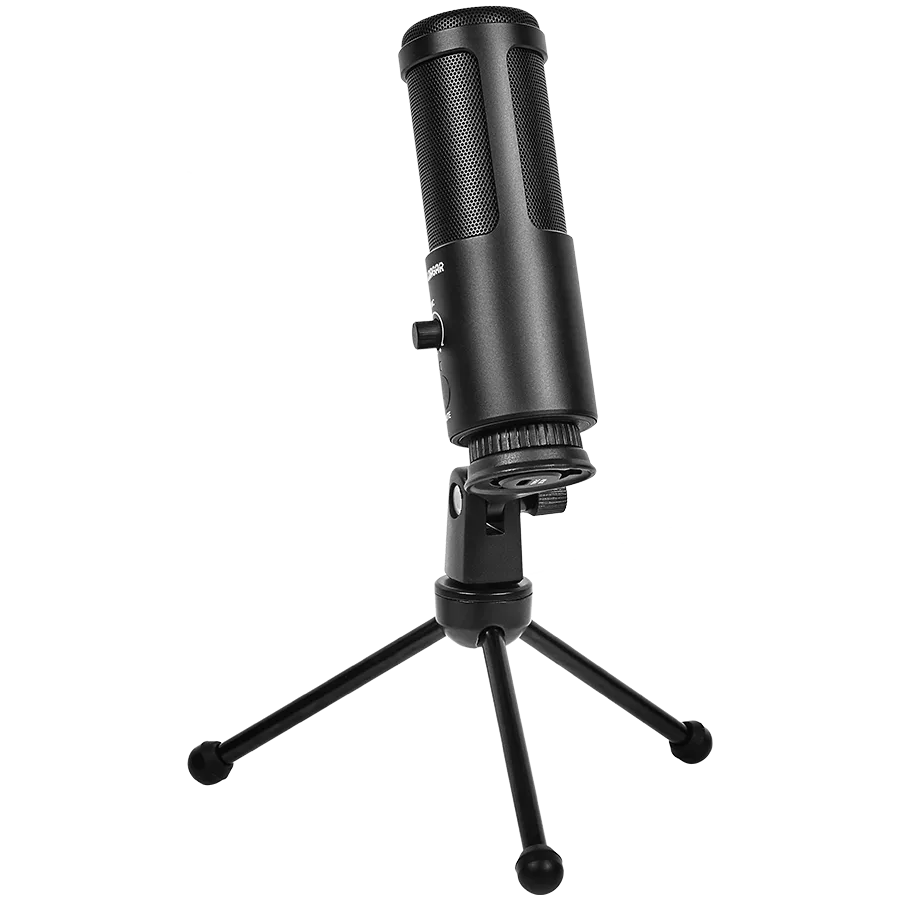 LORGAR Voicer 521, Gaming Microphone, Black, USB condenser mic with Volume Knob, 3.5MM headphonejack, mute button and led indicator, package including 1x F5 Microphone, 1 x 2M type-C USB Cable, 1 xTripod Stand