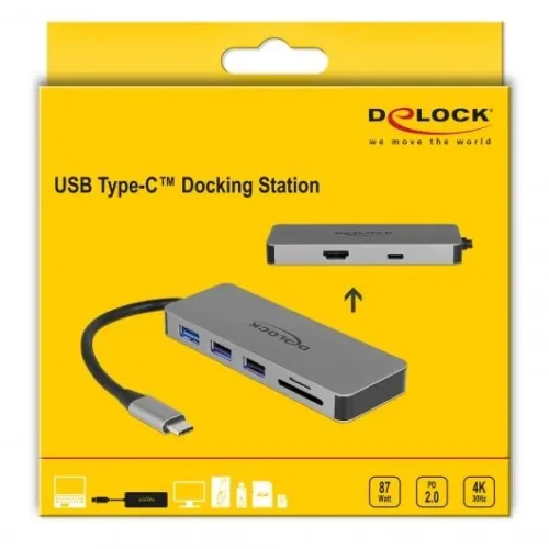 Докинг станция Delock, USB-A, USB-C, HDMI, SD, Micro SD, PD, 4K, Подсветка, Сива