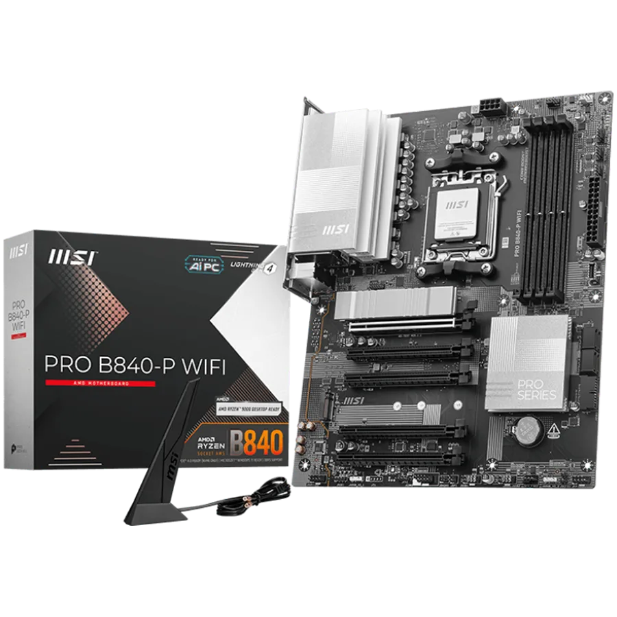 MSI PRO B840-P WIFI, ATX, Socket AM5, 4x DDR5 Dual Channel DDR5 up to 8000(OC)MHz, 5x PCIe x16 slot, 2x M.2 slot, 4x USB 2.0, 2x USB 5Gbps, 1x USB 10Gbps, 1x USB 10Gbps Type-C, HDMI, 7.1 HD Audio, 2.5G LAN, WiFi, BT, 3Y