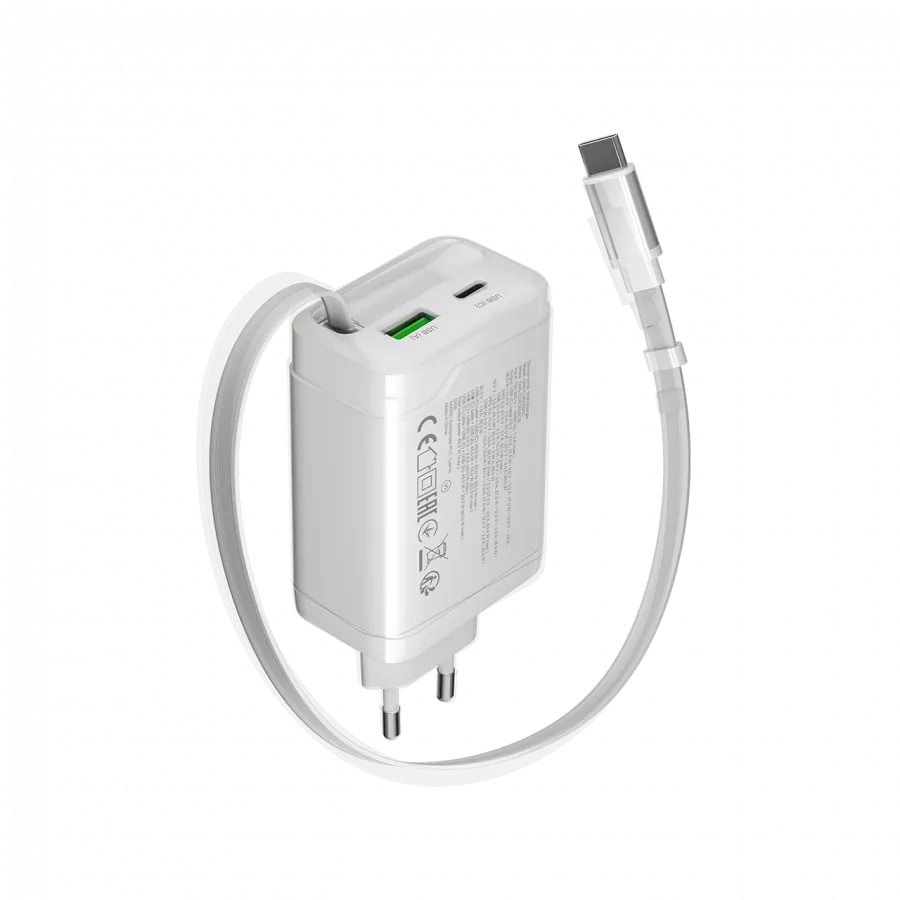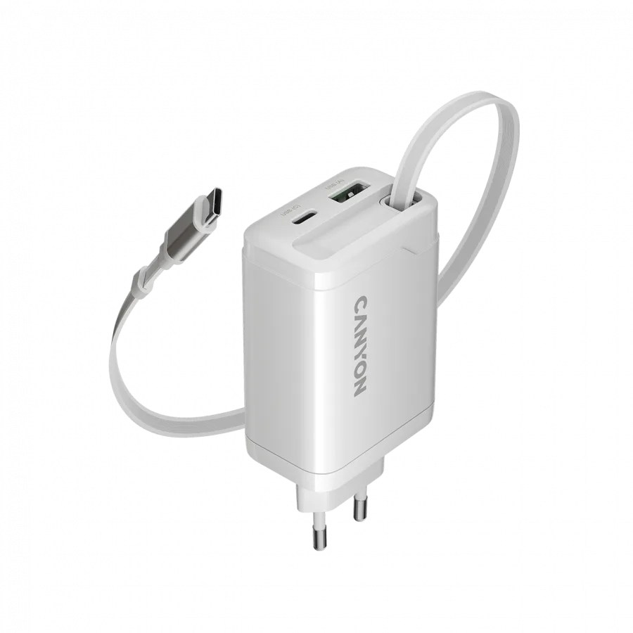Зарядно за мобилен телефон CANYON charger OnCharge 65RC Build-In Cable USB-C 65W 1xPD 1xQC EU White