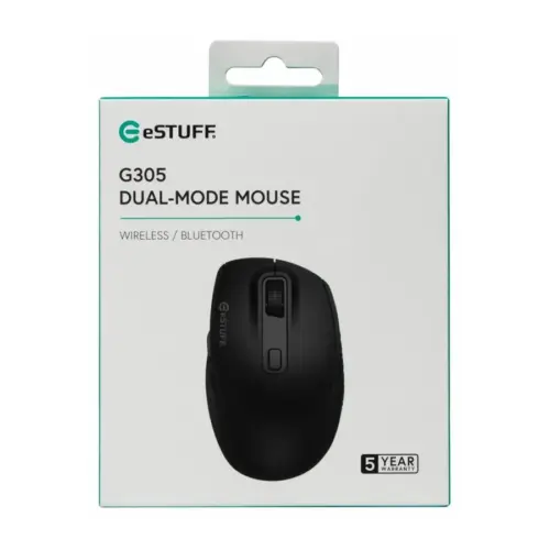 МИШКА eSTUFF G305 Wireless, за дясна ръка – Black – PN GLB214002Безжичната/Bluetooth двойна мишка G305 предлага лека и удобно изваяна форма за дясна ръка с безшумни бутони за щракване, странични бутони и селективна чувствителност от 1000 до 1800 dpi, което ви осигурява бърз и прецизен контрол за удобна целодневна употреба на работа, у дома или в движение.Свържете мишката си безпроблемно с двоен режим на свързване (2.4GHz безжична или Bluetooth) и превключвайте между двете свързани устройства с едно натискане на бутон, за да подобрите производителността си.Двурежимна свързаностРегулируема 1000-1500-1800 DPIБутони с безшумно щракване