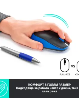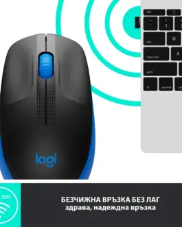 Мишка Logitech M190 – оптична – безжична – синя – PN 910-005907Logitech M190 е безжична мишка, подходяща за длани от среден и голям размер, с удобен контурен дизайн, която следва естествената крива на ръцете.ГОЛЯМ И КОМФОРТЕН РАЗМЕР. БЕЗЖИЧНОСТ БЕЗ КОМПРОМИСLogitech M190 е безжична мишка с голям размер, която гарантира комфорт за онези със среден или голям размер на дланта.ГОЛЯМ РАЗМЕР. ПЪЛЕН КОНТРОЛОптимален комфорт за вашата дясна или лява ръка, благодарение на дизайна, който следва естествените извивки на дланите. В допълнение има специално извити бутони, за да бъдат пръстите ви в перфектна позиция и да се наслаждавате на целодневен комфорт.НАДЕЖДНА БЕЗЖИЧНА ВРЪЗКАРаботете безжично и се движете свободно до 10 м разстояние от приемника, без никакво забавяне или губене на сигнала. Без кабел означава по-организирано бюро и лесно пренасяне от едно място на друго.ПРЕЦИЗНОСТ. СКРОЛИРАНЕ С ЛЕКОТАНавигирайте и скролирайте лесно ред по ред. Оптичният сензор ще ви даде лек и прецизен контрол на почти всяка повърхност.САМО ЕДНА АА БАТЕРИЯ – ИЗДЪРЖА 18 МЕСЕЦАНасладете се на около 18 месеца живот на батерията. Енергоспестяващият режим ще се погрижи да не мислите постоянно за включване и изключване, като се активира автоматично, веднага щом спрете да ползвате мишката.
