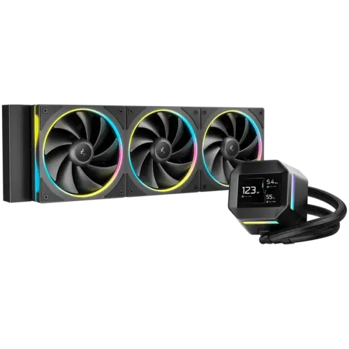 DeepCool LM360, 360mm CPU Liquid Cooler, 2.4″ LCD screen, 3x120mm FL12 SE ARGB PWM Fans, Fluid Dynamic Bearing, Black, Intel LGA1851/1700/1200/1151/1150/1155, AMD AM5/AM4, R-LM360-BKDMMC-1, 3Y