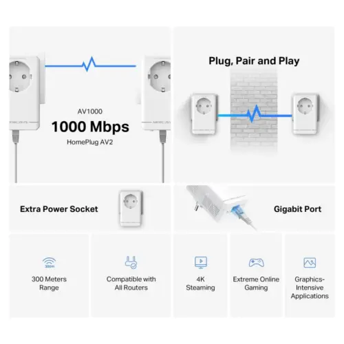Стартов комплект Gigabit Passthrough Powerline адаптери Mercusys MP500P KIT AV1000