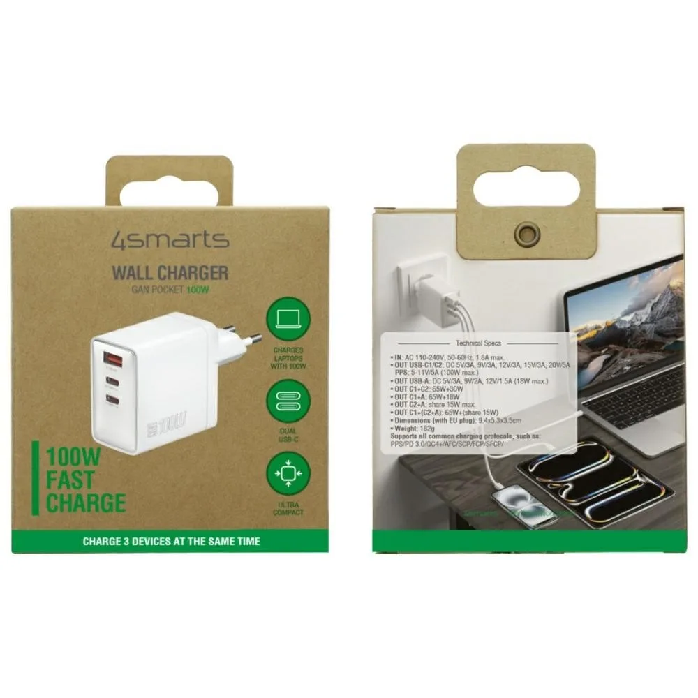 4smarts зарядно Pocket 100W GaN 2xUSB-C + USB-A бял