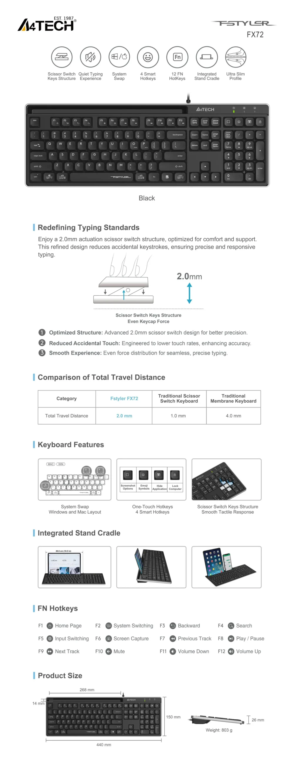 A4tech Fstyler FX72 Жична клавиатура, ниско профилна, ножична технология, кирилизирана, черна