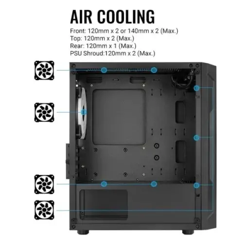 Rear: 1 x 120 mm FRGBОПЦИОНАЛНИ ВЕНТИЛАТОРИ : Front: 120 mm x 2 or 140 mm x 2 (Max.)
