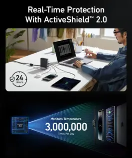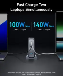 240W Super Power: One USB-C port provides power up to 140W and the other three ports provide the remaining 100W, you can charge 4 devices simultaneously with a maximum power of 240W. Provides power to two Лаптопs simultaneously, with USB-C port 1 providing power 140 W, and the USB-C 2 port provides 100 W power.