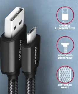 Premium connection Micro USB USB-A Data and Charging AXAGON BUMM-AM10AB HQ USB 2.0 cable with Micro USB male and USB-A male connectors. The cable is designed for fast data transfers and phone, tablet and other mobile device charging. It supports up to 480 Mb/s data transfer and charging with current up to 2.4A.