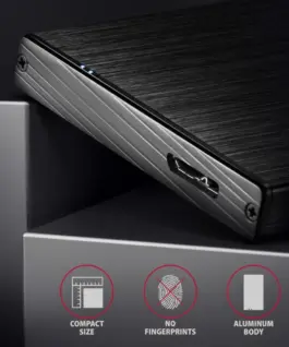 The compact aluminum AXAGON EE25-XA6 external ALINEbox with USB 3.2 Gen 1 (USB 3.0) interface designed for 2.5″ SATA hard disks or SSDs.