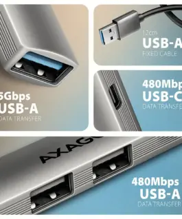 The USB hub offers four USB outputs one USB-A 5Gbps, ideal for fast connection of external drives or flash drives. Two standard USB-A 480Mbps outputs are sufficient for reliable connection of a mouse, keyboard, or printer. The fourth USB-C 480Mbps data connector allows the connection of most mobile phones and other devices with a common transfer rate.