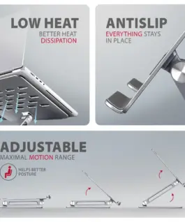 Cutouts in the base ensure optimal heat dissipation from your Лаптоп, increasing its performance and durability. Thanks to the sophisticated design, you can easily adjust the tilt angle, even with the device currently in use, for maximum comfort and efficiency when working.