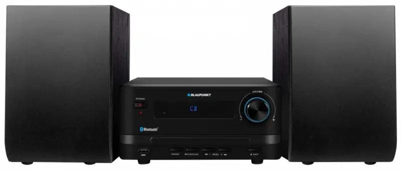 The micro-stereo is an ideal solution for small apartments, creating a mini home entertainment centre. It takes up very little space and combines many functions in one housing while being a stylish addition to any interior.The Blaupunkt MS14BT model, equipped with the Bluetooth function, allows you to play songs saved on your smartphone, Лаптоп or those available on the Internet services.The built-in CD player with MP3-files reader enables you to play Audio-CDs and MP3 files available on recordable CD-Rs and rewritable CD-RWs. The unit also has a USB port to which you can connect any Тип of USB flash drive and play the audio files saved there.The manufacturer has equipped this modern device with an equalizer with POP, ROCK, JAZZ, CLASSIC and DANCE factory settings. These enable the user to adjust the music to the Тип of material being listened to and get carried away by his favourite sounds.This mini hi-fi set also features FM radio with a 30 station памет, which allows you to program the frequency of your favourite stations. This feature eliminates the need to always search for your favourite radio station that broadcasts popular hits. The clock and alarm function will wake every sleeper with the sounds of his favourite music.The built-in amplifier has an output power of 15 W RMS, and the maximum power of the whole unit is 45 W.The MS14BT model is very elegant, and its operation is facilitated by remote control and a legible LED display.