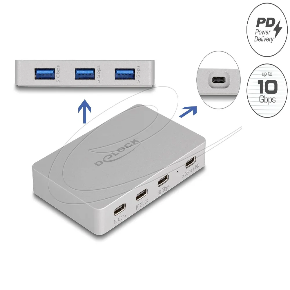 Delock Хъб USB-C, 7 порта, 3x USB-A 5 Gbps, 3x USB-C, 1xUSB-C PD 85 W