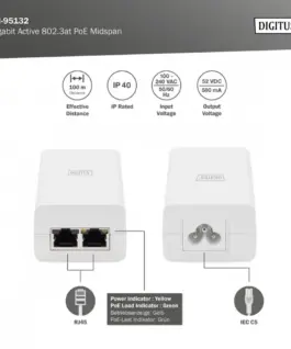 The DN-95132 is an active indoor PoE midspan injector захранващ блок designed specifically for complex backhaul and networking applications. Provides 52 V DC, 0.58 A power for external devices requiring PD power through 2 pairs of output sockets. The solution supports both 10/100 Base-T and Gigabit compatible devices. The solution works with devices that support PD PoE with a power of 30 W, such as wireless access points, WLAN routers, network cameras, IP phones, radio devices and other end devices Съвместим с power over Ethernet. The solution is fully compliant with the PoE IEEE802.3af standard. The device has a plastic housing protected against fire with a protection level of IP40. The solution supports a wide input voltage range of 100-240 V AC, 50 or 60 Hz. It has a detection chip inside that recognizes and classifies a power-demanding device (PD) before power is supplied to that device. Provides power only when a device supporting the PD (Power Delivery) standard is detected.
