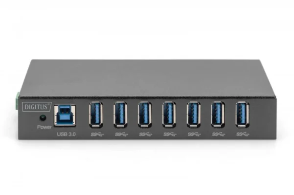 The DIGITUS Industrial USB 3.0 Hub is ideal for industrial applications thanks to its metal housing. It can be wall-mounted or mounted on a mounting rail and connected to a Компютър, Лаптоп, or server using the included USB 3.0 cable. It supports the USB 3.0 SuperSpeed standard with data transfer rates of up to 5 Gbps. It is also backward Съвместим с USB 2.0 and USB 1.1. The hub can be powered via a two-wire terminal block connection (+9V to 24V). An external захранващ блок can optionally be connected to the DC jack.