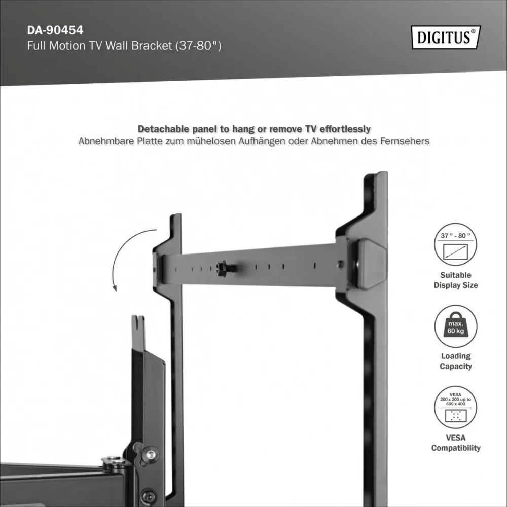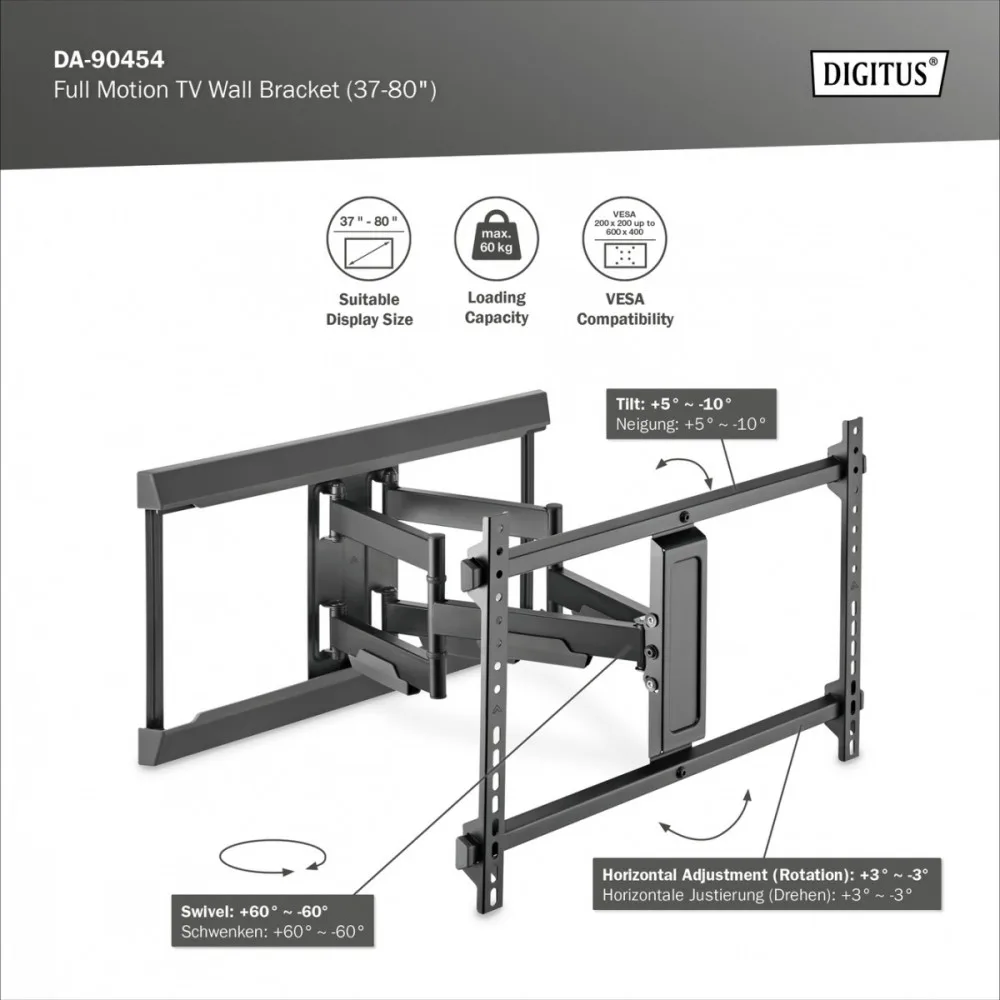 The DIGITUS wall mount for VESA-mounted monitors with a screen diagonal of 37 to 80 inches offers a convenient and flexible way to mount your TV/monitor on the wall. Offering a maximum load capacity of 60 kg, this mount can also safely hold larger monitors without losing stability. Thanks to the functionality of the boom from 6.3 to 53.6 cm, you can adjust the monitor to the perfect position, thus ensuring the perfect viewing angle. Whether you want to tilt your screen to avoid glare or turn it sideways for the best viewing experience, this wall mount allows you to easily adjust it to a convenient position. The monitor can be rotated from +60 to -60° and the tilt angle can be adjusted from +5 to -10°. Horizontal adjustment (rotation) in the range of +3 to -3° allows you to precisely position the monitor and ensure its perfect orientation. Additionally, the holder arms on the fixed wall plate can be moved sideways and locked in the desired position for an optimal viewing experience. Thanks to the built-in cable management solution, the wall mount has an aesthetic appearance and also avoids tangled cables.