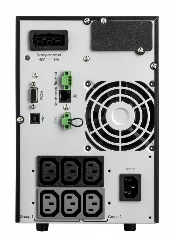 UPS with double conversion online 1500 VA/1350 W, multilingual LCD display, energy meter, 6 IEC 10 A sockets (2 manageable groups), slot for optional management board, USB and serial ports, potential-free contacts, RPO connector, management software захранващ блок Съвместим с the virtual environment, batteries replaceable during operation of the device, long emergency work time with four optional EBM modules.