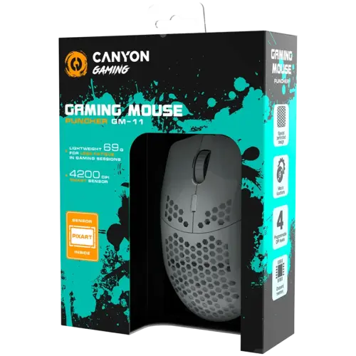 Геймърска мишка CANYON Puncher GM-11, Gaming Mouse with 7 programmable buttons, Pixart 3519 optical sensor, 4 levels of DPI and up to 4200, 5 million times key life, 1.65m Ultraweave cable, UPE feet and colorful RGB lights, White, size:128.5x67x37.5mm, 105g