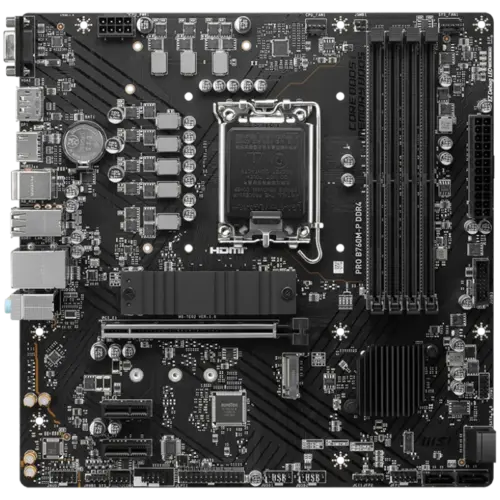 MSI PRO B760M-P DDR4, mATX, Socket 1700, Dual Channel DDR4 4800(OC)MHz, 1x PCIe x16 slots, 2x M.2 slots, 1x HDMI, 1x DP, 1x VGA, 1x USB 3.2 Gen 2 Type-C, 1x USB 3.2 Gen 1, 4x USB 2.0, 7.1 HD Audio, 1Gbps LAN, 3Y