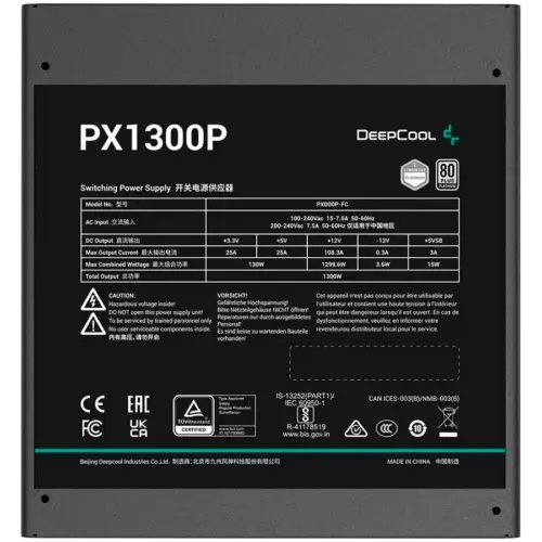 DeepCool PX1300-P, 1300W, 80 Plus PLATINUM, Fully Modular, Flat Black Cables, 135mm FDB Fan, Fluid Dynamic Bearing, 150x160x86mm (W x L x H), ATX 3.0, OPP/OVP/SCP/OTP/OCP/UVP/NLO/SIP, 12Y, R-PXD00P-FC0B-EU