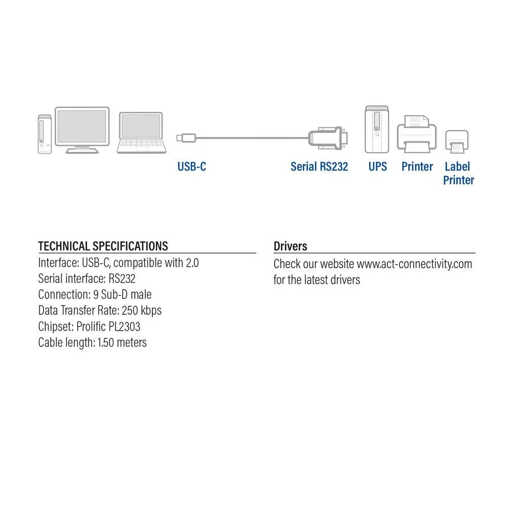 Конвертор ACT AC6002, USB-C мъжко – RS232 мъжко, 9 pin, 1.5 м, Черен