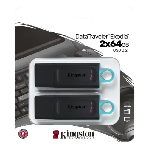 Флаш памет Kingston DataTraveler Exodia – USB flash drive – 64 GB – 2 броя – PN DTX/64GB-2PKingston DataTraveler Exodia е с USB 3.2 Gen 1 производителност за лесен достъп до лаптопи, настолни компютри, монитори и други цифрови устройства. DT Exodia позволява бърз трансфер и удобно съхранение на документи, музика, видеоклипове и други. Практичният му дизайн и модерните му цветове го правят идеален за ежедневна употреба на работа, у дома, в училище или където и да е необходимо да вземете данните си.Максимална преносимост.Разнообразие от капацитети с цветна примка, която лесно се закрепва към ключодържатели.Бързо и удобно.Лекото решение за съхранение със скорости на USB 3.2 Gen 1, което е лесно за носене със себе си.