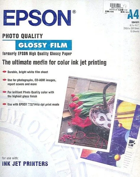 ХАРТИЯ EPSON PHOTO QUALITY GLOSSY FILM – A4 Size – 210 mm x 297 mm – PN 41071 – 15 листа