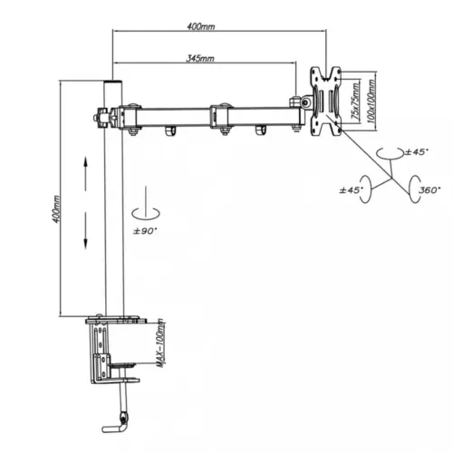 Desk mount for 1 LED/LCD monitor 13-32″ L-01XS ART: – features a cable management system – wide adjustment range thanks to three bending points and height adjustment – allows for virtually any monitor position, including pivot mode – dual mounting options: to the edge of the Таблетop or in a Таблетop opening – vertical adjustment (tilt): -45 to +45 degrees – horizontal adjustment (swivel): -90 to +90 degrees