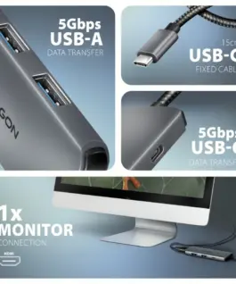 The multi-port USB-C 5Gbps hub AXAGON HMC-5H8K expands your Лаптоп, Компютър or phone with five ports. Via the double-sided USB-C connector, you can quickly and easily connect a monitor and three USB devices to the Компютър at the same time. You also get the possibility to supply Лаптоп using Power Delivery technology at the same time. The USB-C hub will provide you with a simple and compact 5in1 docking station for modern Лаптопs.