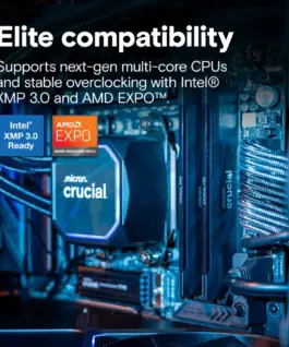Push performance to the next level with the blazing speed and massive bandwidth of Crucial DDR5 Pro OC Gaming Memory. Mobilize the power of low latency to beat the clock and fuel your next win instead of worrying about performance bottlenecks. This powerful, high-performance memory supports next-gen multi-core CPUs and stable overclocking with Intel XMP 3.0 and AMD EXPO. Available in black or white.