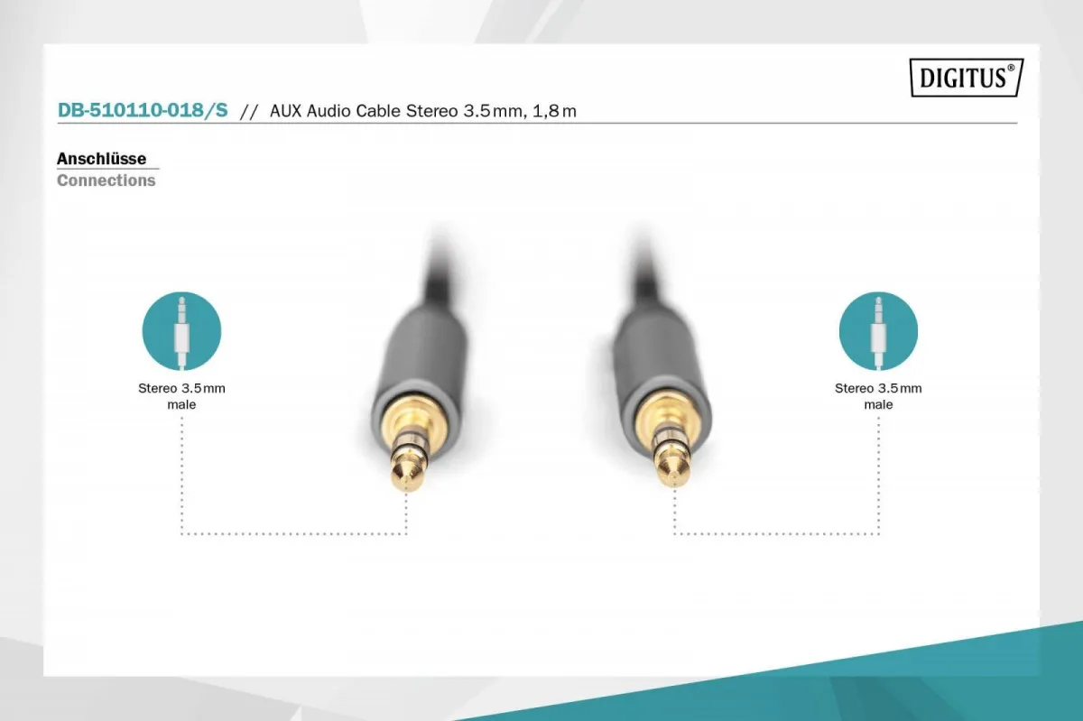 Aux/mini jack cable with 3.5mm mini jack plugs (male/male) transmits excellent sound quality to headphones, headsets or speakers from mobile phones, computers, MP3 players, car stereos and other devices with an aux 3 connector, 5mm. Gold-plated contacts ensure the highest transmission quality and perfect sound transmission.