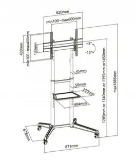 It is suitable for televisions with a screen diagonal of 37“- 70“ with a weight of up to 50 kg and can be used in various locations such as offices, conference rooms, restaurants, hospitals, etc. Four possible height settings for the mounting plate allow adjustment to the desired height. The tool-free tilt adjustment provides the optimum angle for viewing the screen. Thanks to the (two) castors with locking function in position, the TV trolley can be easily moved and stopped as required. The integrated cable management solution ensures a tidy appearance. Notepad, player etc. can be placed on the practical shelf.