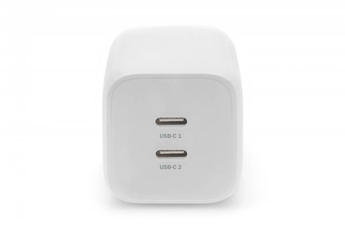 The DIGITUS dual-port charging adapter is a high-performance travel charger with a maximum output power of 65 watts. The solution is equipped with 2 Тип-C connectors, supports charging with a total power output of up to 65 W, so it can charge 2 devices (with 45 W and 20 W) simultaneously. Multi-protocol compatibility (with PPS function, support for Samsung S20, S20+, S10, S10+, Note10 and other Таблетs and smartphones). Greater safety is provided by integrated overvoltage and short-circuit protection and overcurrent protection. In addition, integrated overheat protection prevents possible overloads and damage to the charger or connected devices.