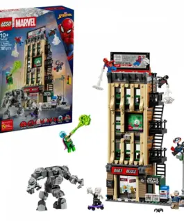 The LEGO Marvel Daily Bugle set includes minifigures of Spider-Man, Miles Morales, Ghost Spider, J. Jonah Jameson, Mysterio, Venomized Captain America, and Rhino, plus three transparent rods and two transparent bricks for creating airborne action scenes. The set also features a movable Rhino mech with an opening cockpit. Detailed interiors include offices, a reception area, a newsroom tech room, a cash vault, and a working lever to change billboards. Outdoors, theres a fire escape, a movable newspaper stand, and a street corner with a traffic light.