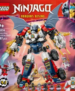 Boys and girls aged 9 and up can enjoy endless play possibilities recreating exciting action from season 3 of the NINJAGO Dragons Rising TV show with Zanes Ultra Combiner Mech (71834) toy 4-in-1 building set.