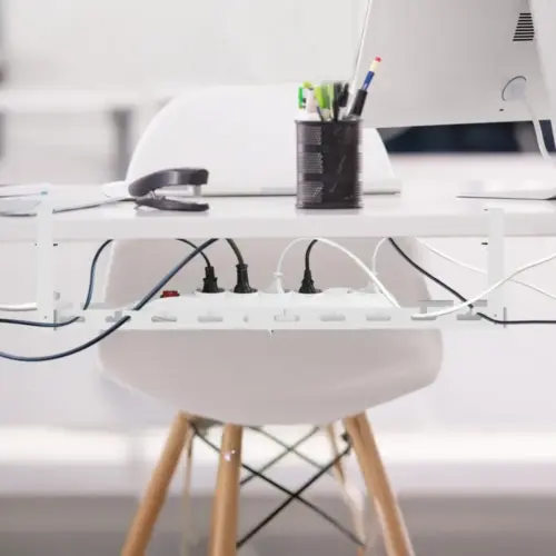 The design is equipped with pass-through holes, which make it easier to guide cables and prevent them from getting tangled under the desk. Aesthetic workmanship and solid materials ensure durability and stability even under heavy use. Thanks to its versatility and functionality, the organizer allows you to maintain order, improve safety and aesthetics of any computer or workstation.