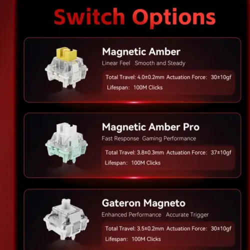 МултимедийнаСУИЧОВЕ, МАРКА : AmberСУИЧОВЕ, ТЕХНОЛОГИЯ : MagneticСУИЧОВЕ, ТИП : LinearСУИЧОВЕ, ИМЕ : Magnetic Amber ProФАБРИЧНА СМАЗКА : ДаСУИЧОВЕ, ЖИВОТ : 100 Million keystrokesСУИЧОВЕ, ХОД ЗА АКТИВАЦИЯ : ProgrammableОБЩ ХОД НА СУИЧА : 3.5±0.2mmСИЛА ЗА АКТИВАЦИЯ : 30±10gfСМЕНЯЕМИ СУИЧОВЕ : ДАКЛАВИШИ, МАТЕРИАЛ : PBTКАПАЧКИ НА КЛАВИШИТЕ : PBT double-shot keycapsМАТЕРИАЛ, ОСНОВА : АлуминийЧЕСТОTА НА ПРЕДАВАНЕ : 8000 HzЧЕСТОТА НА СКАНИРАНЕ : 32 KHzЗАБАВЯНЕ ПРИ ОБРАБОТКА : 0.125 msБРОЙ КЛАВИШИ : 60ПОДСВЕТКА : RGB
