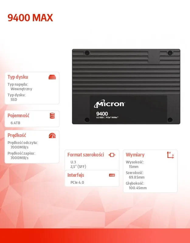 Micron SSD drive 9400 MAX 6400GB NVMe U.3 15mm Single Pack