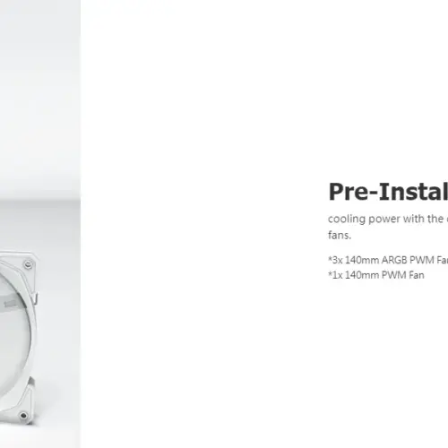Above PSU: 2 x 120mmБРОЙ DVD 5.25″ ГНЕЗДА : 0БРОЙ 3.5″ ГНЕЗДА : 2БРОЙ 2.5″ SSD ГНЕЗДА : 5РАЗШИРИТЕЛНИ СЛОТОВЕ : 7МАКС. РАЗМЕР ОХЛАДИТЕЛ : 180 mmМАКС. РАЗМЕР ВИДЕОКАРТА : 400 mmЦВЯТ : БялДОПЪЛНИТЕЛНИ : Fan Hub: 1 to 6 ARGB & PWM Hub