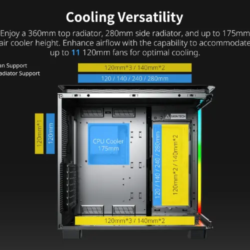 Montech кутия KING 95 Pro, Dual Chamber Mid-tower Case, 6 ARGB Fans, 2 Front Panels, Black