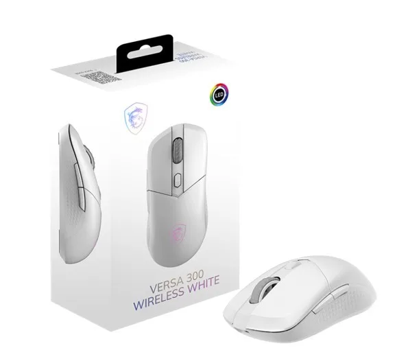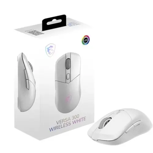 The VERSA 300 WIRELESS WHITE is a lightweight and versatile mouse, ergomomically designed for both gamers and professionals, weighing in at just 60 grams. It offers flexible connectivity options with MSI SWIFTSPEED 2.4 GHz wireless, Bluetooth, and wired for various setups. Featuring a highly accurate optical sensor with up to 8,000 DPI, it ensures precise tracking and responsiveness. Built with micro switches rated for over 30 million clicks, the VERSA 300 WIRELESS delivers durability, performance, and comfort.