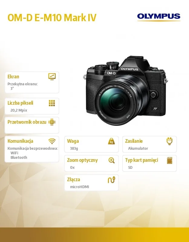 The greatest advantage of the Olympus system is its size: almost half the size and weight of other interchangeable lens systems, it provides photographers with extraordinary portability. This applies not only to the cameras but also to the lenses. The combination of high resolution, excellent performance, and effective image stabilization results in sharp, top-quality images regardless of the circumstances and conditions of the shoot. The E-M10 Mark IV is the smallest camera in the OM-D line. With an improved grip and the latest image processing technology, it is an excellent option for anyone looking for a compact and ergonomic camera for special tasks.