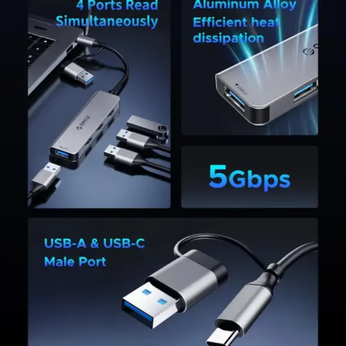 Orico хъб HUB USB-C/A 4 port – USB3.0 x 1, SD/TF x 2, USB2.0 x 2, USB-C x 2, Aluminium – YSA6-U3-GY