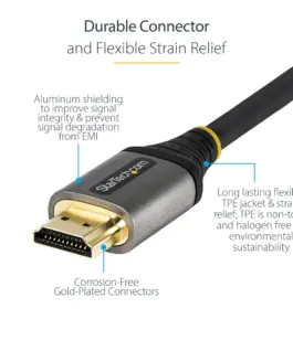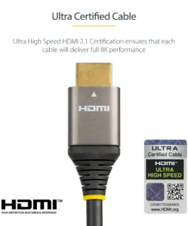 Ултра високоскоростен HDMI 2.1 кабел, сертифициран, 48 Gbps, 8K 60 Hz/4K 120 Hz HDR10+ eARC, Ultra HD 8K HDMI кабел / кабел с TPE яке, за UHD монитор/телевизор/дисплей – Dolby Vision/ Atmos, DTS-HD (HDMM21V2M) – HDMI кабел с Ethernet – PN HDMM21V2MВИСОКОЕФЕКТИВЕН 8K КАБЕЛ: 6,6 фута (2 м) Ultra HD HDMI 2.1 кабел, 8K/5K 60Hz, 4K 120Hz видео (48Gbps), Dynamic HDR10+ &, Dolby Vision за висок контраст и ярка картина, eARC, DTS-HD Master Audio/DTS:X/Dolby TrueHD/Atmos за висококачествен звук, HDCP 2.3СЕРТИФИЦИРАН КАБЕЛ: Ултра високоскоростен HDMI 2.1 сертификат гарантира, че всеки кабел ще осигури пълна 8K производителност и повече, Обвивка в лят алуминиев екран за подобряване на целостта на сигнала и предотвратяване на влошаване на сигнала поради EMI смущенияИЗДРЪЖЛИВ: UHD HDMI кабелът е тестван да издържи на 10 000+ поставяния и 600+ цикъла на огъване при 120°, некорозионни позлатени конектори, Дълготрайно гъвкаво TPE яке и облекчаване на напрежението, TPE е нетоксичен и не съдържа халогени за екологична устойчивостПРИЛОЖЕНИЯ: 8K HDMI кабел, идеален за търговски, AV продукция и приложения с висока разделителна способност, За дома, офиса, класната стая, Свържете компютър, лаптоп, десктоп, работна станция или Apple M1/M2/M3 Pro/Max MacBook към телевизор/монитор/дисплей/проектор, Samsung/Sony/Apple TV/Dell/LG,СПЕЦИФИКАЦИИ: 2 м (6,6 фута) | HDMI 2.1 | Сертифициран свръхвисокоскоростен HDMI кабел 48Gbps | HDMI мъжки към мъжки | 6 mm (0,24″) външен диаметър, 30AWG | TPE яке | Al-Mylar фолио с оплетка EMI Shielding | Работи с HDMI 2.0b/2.0a/2.0/1.4 | StarTech.com доживотна гаранция