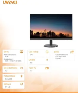 The LW2403 24-inch Full HD monitor features an IPS wide-viewing-angle panel, offering vivid and consistent colour reproduction from any angle. Designed to fit seamlessly into everyday office and home environments, it is well-suited for routine computing tasks, internet browsing, and general multimedia use. With reliable image quality and user-friendly features, the LW2403 delivers a comfortable and dependable viewing experience for day-to-day use.