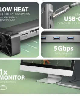 The elegant aluminum body ensures not only mechanical resistance, but also passive cooling. The package includes extensions that allow the hub to be used as a pad under the Лаптоп, which will ensure better cooling thanks to greater airflow under the Лаптоп. At the same time, it improves ergonomics at your workplace.