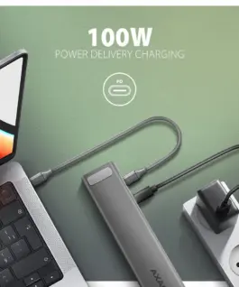 One of the USB-C connectors is used to connect to the Лаптоп with the included 25 cm long cable with a reversible USB-C connector on both ends. The second USB-C connector is reserved only for powering and simultaneous charging of phone or Лаптопs using Power Delivery 3.0 technology with a power of up to 100W. Connect a suitable USB-C Power Delivery charger into the hub and connect the hub to a Лаптоп that supports Power Delivery. This saves one USB-C port.